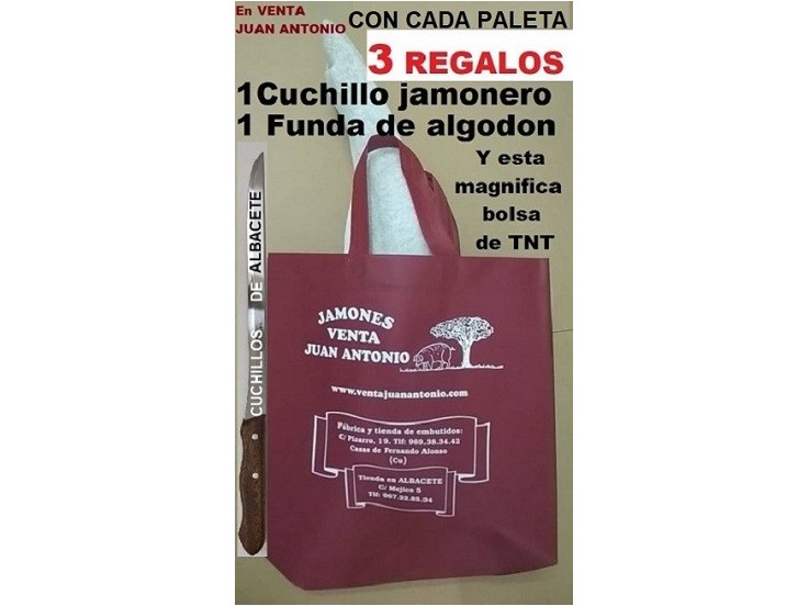 Con CADA paleta 3 REGALOS: 1 funda de algodón, 1 bolsa de tela TNT con asas y 1 cuchillo jamonero de Albacete.