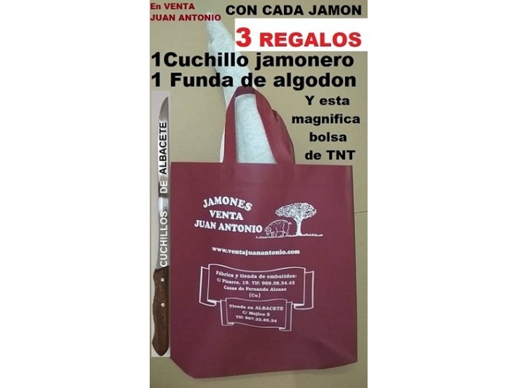 Con CADA jamon 3 REGALOS: 1 cuchillo jamonero, 1 funda de algodón y 1 bolsa de TNT.